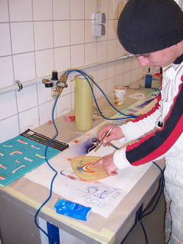 Nichts anderes bedeutet "airbrush": Eine Mini-Farb-Spritz-Pistole, mit der ganz feine dekorative Arbeiten ausgeführt werden können: Jeder kennt die Gemälde auf Auto-Karosserien oder Motorrad-Tanks. Und unser Kollege und Maler- und Lackierermeister Teitge kennt sich damit besonders gut aus.