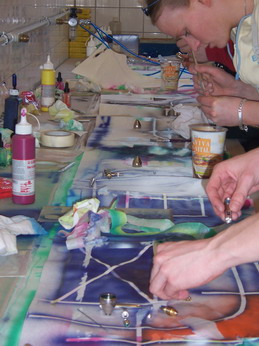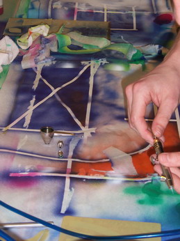 Nichts anderes bedeutet "airbrush": Eine Mini-Farb-Spritz-Pistole, mit der ganz feine dekorative Arbeiten ausgeführt werden können: Jeder kennt die Gemälde auf Auto-Karosserien oder Motorrad-Tanks. Und unser Kollege und Maler- und Lackierermeister Teitge kennt sich damit besonders gut aus.